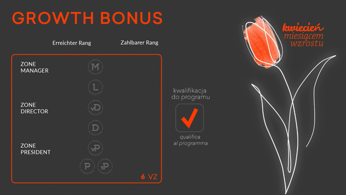 Was bedeutet das? Egal welchen Rang Sie sich gerade befinden, erhalten Sie die Qualifikation zum Bonus! Sie hatten einmal den Rang Leader und sind derzeit Business Partner? Kontrollieren Sie, welche Bonus-Qualifikation Sie haben, bauen Sie Ihre Gruppe wieder auf, erhöhen Sie den Unsatz entsprechend dem Ziel, und Sie erhalten einen zusätzlichen Bonus!