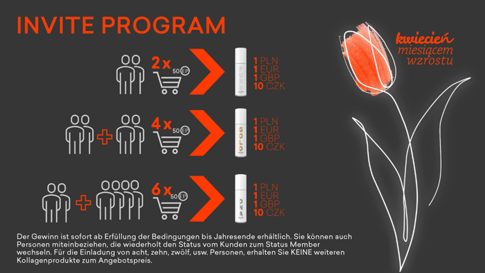 Der Gewinn ist sofort ab Erfüllung der Bedingungen bis Jahresende erhältlich. Sie können auch Personen miteinbeziehen, die wiederholt den Status vom Kunden zum Status Member wechseln. Für die Einladung von acht, zehn, zwölf, usw. Personen, erhalten Sie KEINE weiteren Kollagenprodukte zum Angebotspreis.