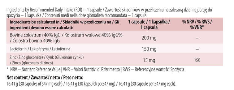 Ingredients: Beef milk colostrum (40% IgG), milk lactoferrin, zinc (zinc gluconate), fish gelatin, bulking agent (microcrystalline cellulose), anti-caking agent (magnesium salts of fatty acids).